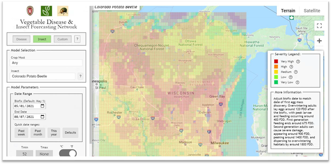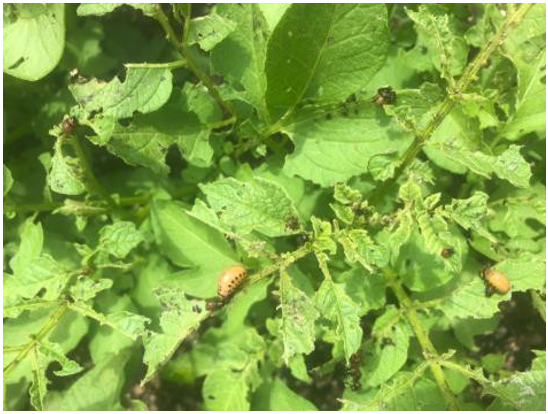 Vegetable Entomology Webpage: https://vegento.russell.wisc.edu/ Colorado potato beetle – https://vegento.russell.wisc.edu/pests/colorado-potato-beetle/ Emergence of the second generation of Colorado potato beetle (CPB) adults has been underway since mid-July. These adult beetles can feed voraciously and severely defoliate a crop quickly if left untreated. If the condition of the host plants are good, a small portion of these second generation adults will attempt to produce another (3rd) generation. Under normal conditions, these adults may be able to produce only a partial 3rd generation and then will seek overwintering sites as the crop begins to senesce. Typically, there are two discrete generations of beetles per year in South-Central Wisconsin and only a single generation in Northern Wisconsin. As temperatures in the mid-summer have increased over the past 20-30 years and fall temperatures have become more conducive for insect development, we plan to see greater success of a 3rd generation in central Wisconsin. Many locations, however, are experiencing only low to moderate populations of CPB as a result of very good control that has been achieved targeting larvae of the earlier generation (June). In this instance, producers and pest management practitioners should monitor populations and evaluate defoliation levels. Post-flowering potato canopies can withstand up to 8-10% defoliation without suffering any economic loss in tuber yields. Defoliation is always a challenge to estimate in the second half of the production season when canopies lay down and other maladies in the canopy (eg. early blight) are often more prevalent.