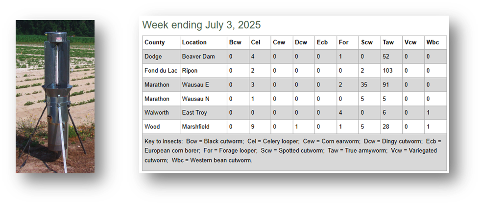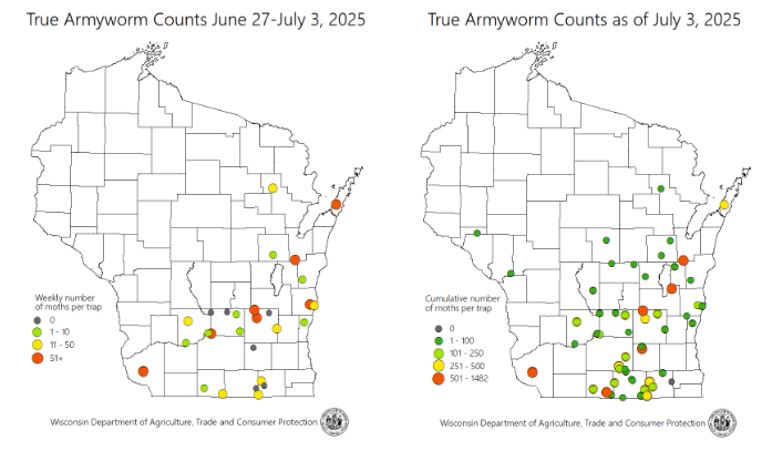 Early black light captures illustrate increasing captures of true armyworm across several locations in central and southern Wisconsin. Moth captures at this time are not considered excessive or extreme, but pest managers should pay attention to younger plants or more recently planted crops in areas where pheromone traps indicate moderate to high captures. The WI DATCP more accurately traps for potentially problematic populations of true armyworm using pheromone traps. A summary of these captures (through July 3, 2025) is illustrated. Armyworms are dark caterpillars measuring up to 2 inches long. They have a dark stripe running lengthwise on the side with a yellow stripe beneath. Dark and light stripes alternate along their back. Armyworms move up from grassy weeds within cornfields or migrate into cornfields from small grain or forage fields. They may hide in soil crevices and beneath clods by day. At night, they chew corn leaves and weaken plants.