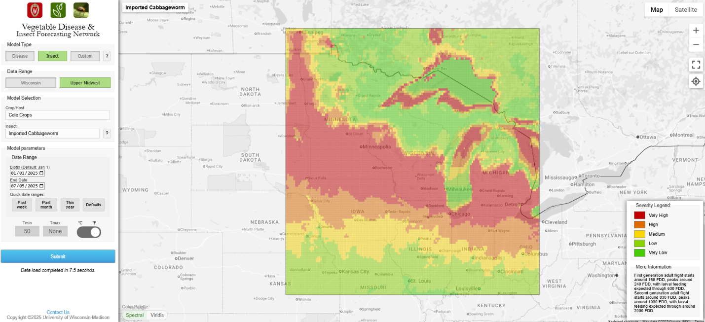For custom values, please explore the UW Vegetable Disease and Insect Forecasting Network tool for P-Days and DSVs across the state (https://agweather.cals.wisc.edu/vdifn). This tool utilizes NOAA weather data. Be sure to enter your model selections and parameters, then hit the blue submit button at the bottom of the parameter boxes. Once thresholds are met for risk of early blight and/or late blight, fungicides are recommended for optimum disease control. Fungicide details can be found in the 2025 Commercial Veg. Production in WI Extension Document A3422: https://cropsandsoils.extension.wisc.edu/articles/2025-commercial-vegetable-production-in-wisconsin-a3422/