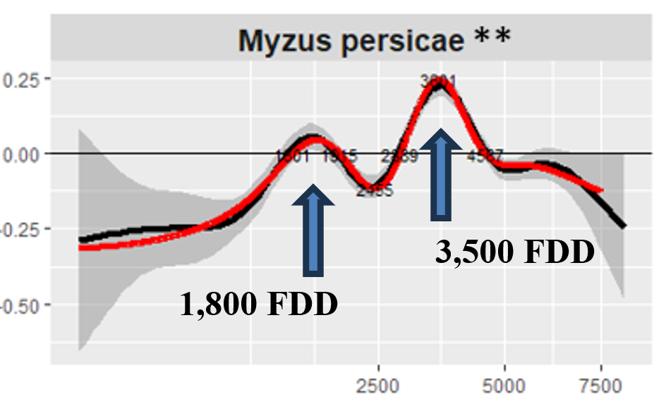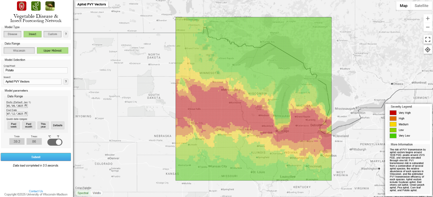 Colorado potato beetles (2nd generation emergence) – (https://vegento.russell.wisc.edu/pests/colorado-potato-beetle/). Second generation adults are appearing now in mid-July across much of central Wisconsin. Adults (emerging from second generation) have been up for two weeks across southern production areas. In northern regions, adult emergence from overwintering is nearing completion and there are many early to middle stage instar larvae (1st-3rd instars) present in fields. This time of the year effectively represents the transition from the 1st full generation to the appearance of the 2nd generation across central Wisconsin. If control of the 1st generation was very successful, producers may see a very slow or gradual appearance of adults. In these instances, managers and scouts should wait until (new) defoliation has reached 3-5% to initiate applications targeting this next generation. Throughout much of southern and central Wisconsin, this second generation will produce adults that will feed far more than their overwintered parents. Under normal conditions in central and northern Wisconsin, these adults may produce only a partial second generation and then seek overwintering sites as the crop begins to senesce. Typically there are two discrete generations of beetles per year in South-Central Wisconsin and only a single generation in Northern Wisconsin. Control options for 2nd generation CPB can be found on the UW Vegetable Crop Entomology, Colorado Potato Beetle Management site. Potato virus Y and management. Important to note, aphid species that can colonize potatoes (Green peach aphid and Potato aphid) were initially detected in only a single field in Langlade County this past week. Our specific degree day model for Green peach aphid (GPA) suggests that initial flight activity from overwintering in more southern latitudes occurs when we have reached approximately 1,800 FDD (base 39). This period of activity represents the ‘average’ timeframe over which this species arrives into central and northern Wisconsin. Important to note, this represents the initial time of arrival when initial founders arrive and begin to colonize potato. This period is often followed by a colonization phase when GPA turn 3-5 successive generations in potatoes if left unmanaged. It is important to scout fields now in seed production areas, and insecticide programs of control should be initiated to limit the establishment of these early populations in susceptible potato once scouting has confirmed their presence in fields. Later in the GPA activity model (e.g. 2,500-3,500 FDD base39) we see another peak in activity, and this represents a time when populations have increased on their summer hosts (potato) and begin to move in search of overwintering hosts (cherry or other Prunus). This period of activity usually occurs in mid-August and lasts into September. This time can be a very vulnerable time for potato producers when large populations of GPA are moving in the landscape and regularly stopping in potato where they are able to inoculate plants with Potato Virus Y (PVY). Given the amount of inoculum planted in the 2025 production season, it is important to be proactive about insecticide programs that can limit the increase of this virus in seed. In potato, PVY can be a yield-limiting pathogen that can cause yield loss in heavily infected commercial lots and in selected, susceptible varieties. The virus may also cause post-harvest losses due to tuber necrosis and reduced storage quality. PVY has been managed in Wisconsin for decades, but in recent years it has re-emerged as a potentially serious disease problem. The emergence of new genetic recombinant strains of PVY that can cause mild disease symptoms, the over-wintering of potato-colonizing aphid species (green peach aphid, potato aphid), and the widespread adoption of potato varieties that express mild symptoms of PVY infection are all thought to contribute to the re-emergence of PVY in Wisconsin. The production season of 2025 brings significant challenges to our seed production area in north-central Wisconsin. First among these challenges is the amount of local inoculum replanted in the region that resulted from a challenging virus management season in 2023-24. This inoculum (many lots) will serve as a source for spread to other fields within the 2025 production season, and it is important to limit this movement of the virus. For most aphid chemical management tools, timing of application occurs with the appearance of the first, small colonies of potato-colonizing aphids. Spraying for colonizing aphids can reduce the spread of PVY within the field. Spray only when scouting indicates aphid populations have become established and scouts can identify small colonies of apterous (wingless) aphids. Critical factors affecting the efficacy of these spray applications include timing, application conditions and coverage. Remember – most vectors of PVY do not colonize potato and their ability to transmit PVY to the plant will not be affected by systemic insecticides. In these instances, non-colonizing aphids (several species) will only intermittently move in and through potato over short durations. In these specific instances, we use anti-feedant compounds to include the paraffinic oils. Several species of non-colonizing aphids (e.g soybean aphid, corn leaf aphid, bird cherry-oat aphid, corn leaf aphid, English grain aphid and pea aphid) can be present moving through the seed crop and at predictable intervals through the season. The timing of these flights have been modeled as a collective, or cumulative risk model and for Wisconsin and the upper Midwest and these map-based projections are available daily at the Wisconsin Vegetable Disease and Insect Forecasting Network site. Our current model predicts the risk of non-colonizing aphids is approaching northern Wisconsin, and producers are alerted to apply paraffinic oils on a 5 to 7 day re-application interv