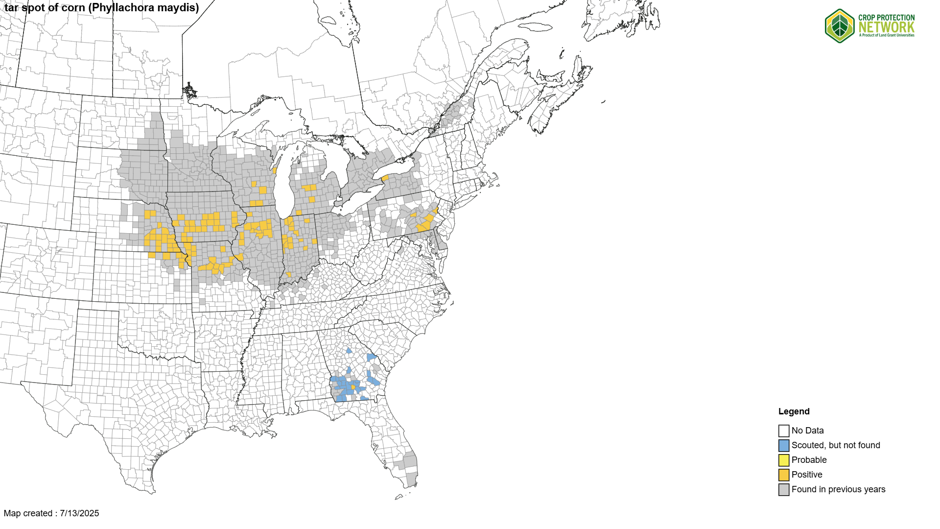 The map of positive reports of corn tar spot in the US during 2025. The gray colored counties indicate locations of past confirmations and golden colored counties indicate locations of current tar spot reports. Blue counties indicate that the pathogen was scouted for, but not found. This information, and many additional pages of updates, forecasting, and management guidance, is maintained at the Crop Protection Network. https://cropprotectionnetwork.org/maps/tar-spot-of-corn