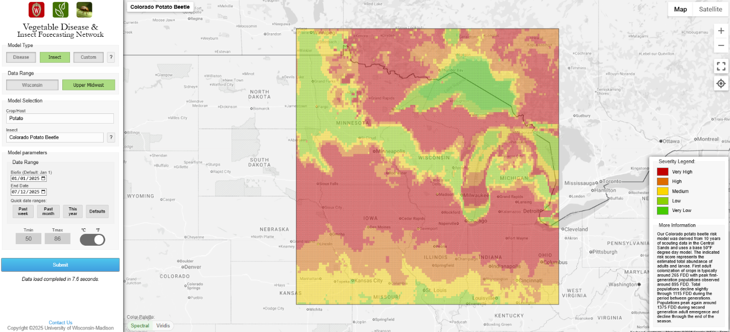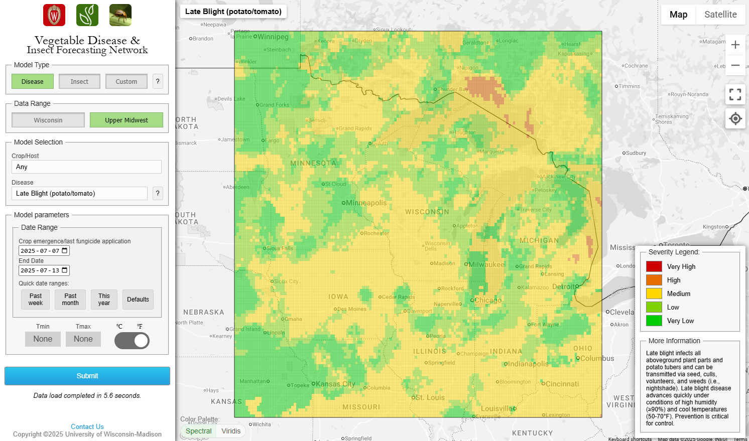 For custom values, please explore the UW Vegetable Disease and Insect Forecasting Network tool for P-Days and DSVs across the state (https://agweather.cals.wisc.edu/vdifn). This tool utilizes NOAA weather data. Be sure to enter your model selections and parameters, then hit the blue submit button at the bottom of the parameter boxes. Once thresholds are met for risk of early blight and/or late blight, fungicides are recommended for optimum disease control. Fungicide details can be found in the 2025 Commercial Veg. Production in WI Extension Document A3422: https://cropsandsoils.extension.wisc.edu/articles/2025-commercial-vegetable-production-in-wisconsin-a3422/