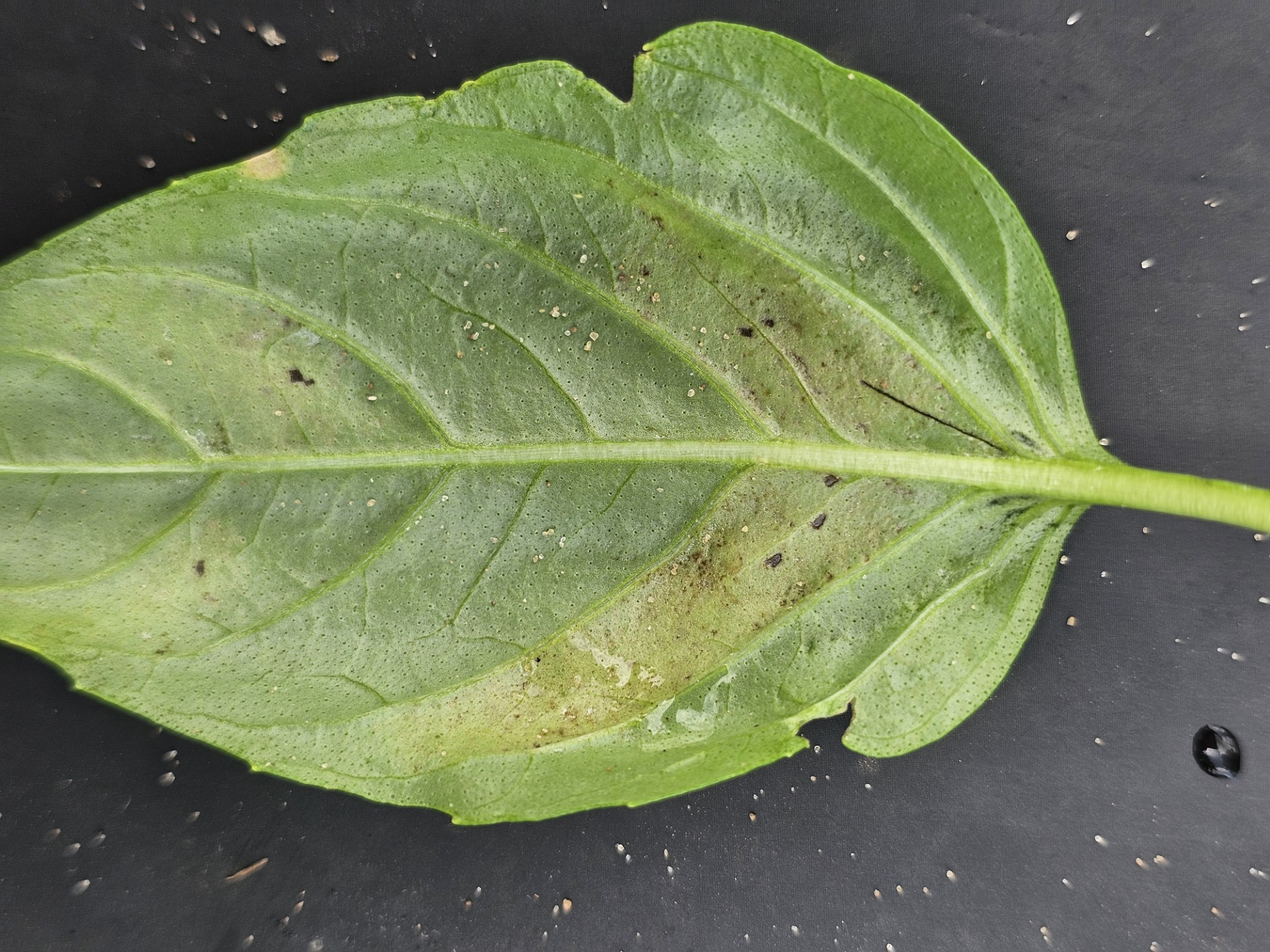 Basil plant showing downy mildew symptoms. Note lesions and yellowing on leaf.