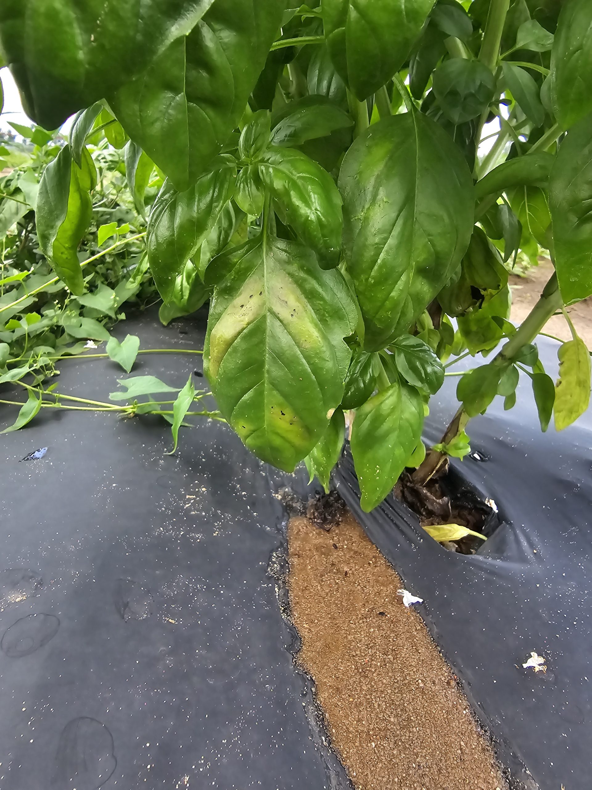 https://www.vegetables.cornell.edu/pest-management/disease-factsheets/basil-downy-mildew/ Whatever type of basil you choose, try to grow your plants in a manner that will keep the plants as dry as possible, thus creating an environment that is less favorable for the downy mildew pathogen to develop and infect. good airflow and rapid drying of plants when they get wet. Avoid overhead watering (e.g., with a sprinkler) that will wet leaves and spread the pathogen; instead, use a drip or soaker hose to water.