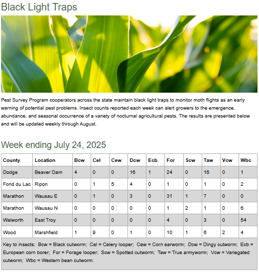 Western bean cutworm counts at select trapping locations. Source: DATCP Home Pest Survey (https://datcp.wi.gov/Pages/Programs_Services/WesternBeanCutworm.aspx)