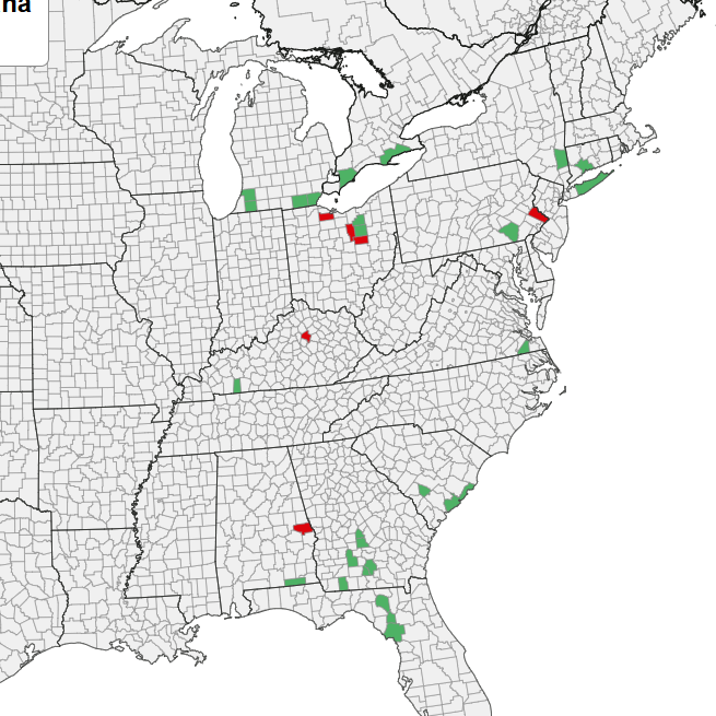 Counties with recent (red) and >1 week old (green) confirmed cases of Cucurbit downy mildew. Source: cdm.ipmpipe.org