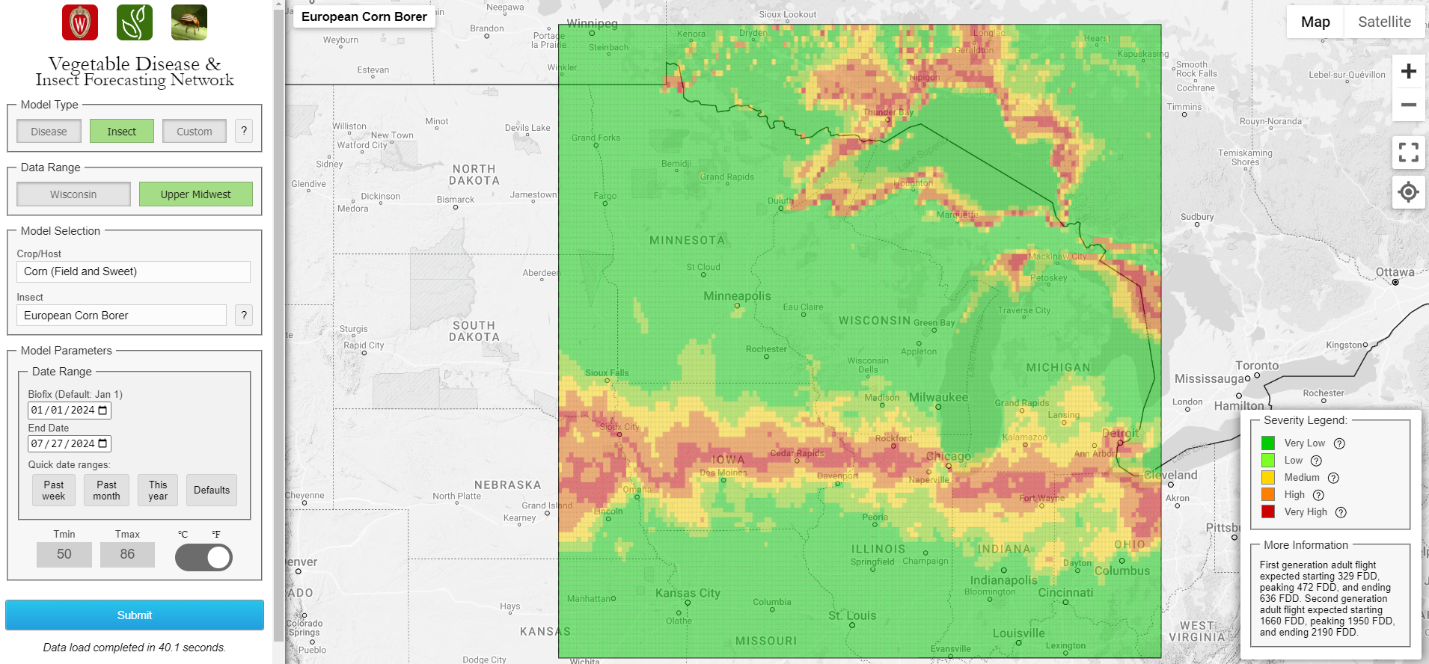Wisconsin Home Pest Survey, adult captures remain very low for ECB at this time and this is consistent with the map predictions from VDIFN. Remain vigilant, however, as infestation risk will change rapidly over the coming 10-14 days as we move into August.