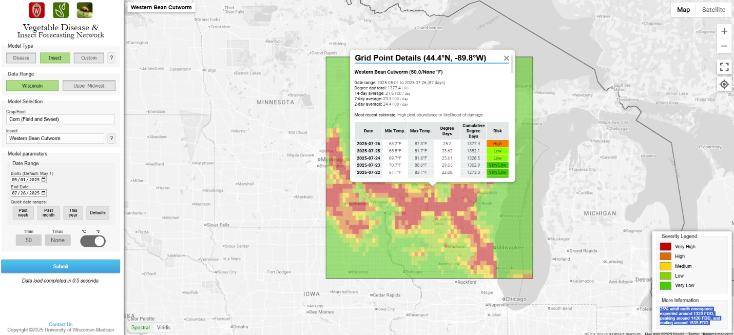 https://agweather.cals.wisc.edu/vdifn (sourced 07/27/2025). Notice areas within the ‘orange or red shaded’ zones indicate high risk zone for adult moth oviposition, and these remain just to our south currently, but will be advancing into the state in the week to come. Sweet corn and green bean producers with susceptible crop stages (silking corn, pin-bean stage green bean) should be scouting for these mobile insects.