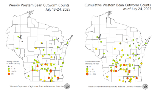 Western bean cutworm adults are well into flight in southern Wisconsin, and it is important to scout for eggs. Weekly captures (Figure below, left) ending last Thursday (July 24) show a rapid increase from the week prior as evidenced by collections detailed by the
