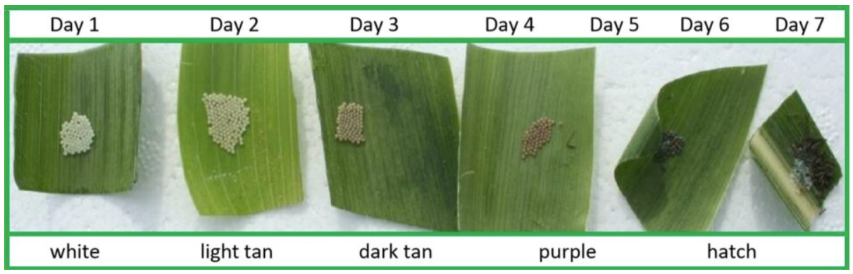 Included is an image of the western bean cutworm egg mass on Day 1 versus a week later when it is close to hatching. As seen in the image, egg masses are initially cream colored and then mature to become purple in color approximately 24-48 hours before they hatch. As is often the case with many caterpillars, newly hatched larvae consume the egg shell, so egg masses are most evident before or immediately after hatch.